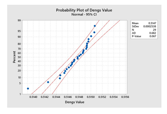 The optimization was executed by using the SSO algorithm with the parameter settings of 30 number of salps with a maximum of 100 iterations. During the optimization, the parameters of SSO were self-tuned for obtaining global optimal solutions that satisfy the goal of objective functions. The algorithms were executed twenty-nine times to attain ingenious pareto-optimal settings. From each execution, a set of pareto-optimal solutions were attained and the best one among the optimal front was selected through Deng’s statistical approach [29]. The optimization performance of the SSO algorithm has been shown in the sample pareto-optimal front (Figure 11). Among the obtained optimal parameter settings through each run, the best one was attained by implementing the Deng’s statistical ranking approach. The solutions were ranked based on the Deng’s value, as mentioned in Table 9. From the table, a higher Deng’s value of 0.51507 was obtained at execution number 15 (As highlighted in bold) and their corresponding parameters, such as 1.004 wt% of r-GO, 600 mm/min of TS, 214 MPa of WP, and 4 mm of SOD, were global optimal parameter settings that provide an improved response characteristic value such as Kt of 2.067° and Ra of 3.18 µm, respectively. In addition, a statistical analysis (Anderson–Darling normality test) was performed to validate the obtained solutions at a 95% confidence level (Figure 12). The results of statistical analysis revealed that the obtained solutions are statistically significant and are normally scattered against actual values, which confirms the efficacy of the proposed optimization algorithm.