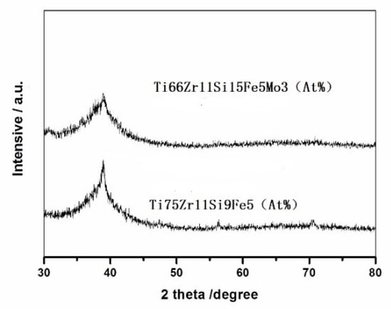 Figure 1 below shows the melt-spun amorphous structure found in the patterns obtained from XRD experiments. From Figure 1, a broad peak can be clearly observed in the 2θ range of 31–48°, and binding experiments can analyze that this broad peak is produced by the amorphous phase. This indicates that both alloys designed have very good amorphous-forming ability. However, it can be seen from the figure that the glass-forming ability of the two alloys is not the same, and the alloy Ti66Zr11Si15Fe5Mo3 (At %) is better than that of Ti75Zr11Si9Fe5 (At %). The high glass-forming ability (GFA) of these two alloys by stabilizing the supercooled liquid region is mainly due to the formation of a new type of glassy structure; the structure has some special features, such as high-density packing, a new local atomic configuration and long-range homogeneity with attractive interactions [,,].