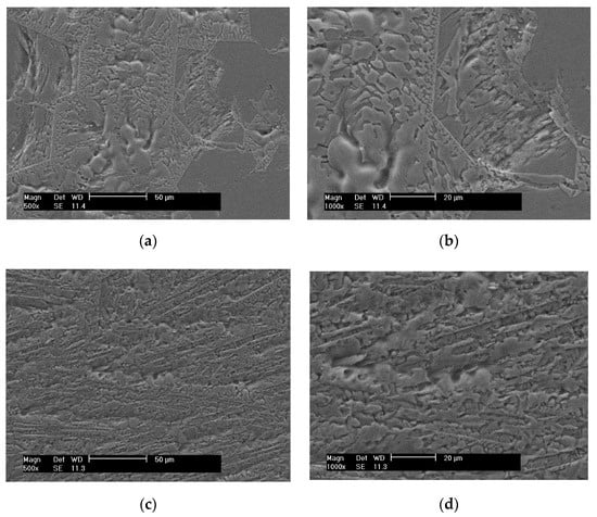 The SEM microstructure of Ti75Zr11Si9Fe5 (At %) and Ti66Zr11Si15Fe5Mo3 (At %): (a) Ti75Zr11Si9Fe5 (At %) (500×), (b) Ti75Zr11Si9Fe5 (At %) (1000×), (c) Ti66Zr11Si15Fe5Mo3 (At %) (500×) and (d) Ti66Zr11Si15Fe5Mo3 (At %) (1000×).