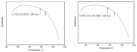 DSC thermograms of amorphous alloys of both Ti75Zr11Si9Fe5 (At %) and Ti66Zr11Si15Fe5Mo3 (At %).