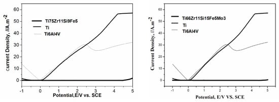 In order to gain a deeper and more comprehensive understanding of the corrosion behavior of these two amorphous alloys, electrochemical measurement was performed in 3 mass% NaCl solution. Before the start of the corrosion test, the alloy specimens were mechanically polished in cyclohexane with silicon carbide paper up to grit 2000, degreased in acetone, washed in distilled water, dried in air and further exposed to air for 24 h for good reproducibility. Figure 5 shows the potentiodynamic polarization curve of both Ti75Zr11Si9Fe5 (At %) and Ti66Zr11Si15Fe5Mo3 (At %) amorphous alloys in 3 mass% NaCl solution open to air at 298 K. As seen in Figure 5, pure Ti and Ti6Al4V alloys are passivated with different current densities. However, both amorphous alloys kept steady current densities at about 0 A.m−2, which suggests that both were hardly eroded by the 3 mass% NaCl solution. Based on the data, it is concluded that the both amorphous alloys relatively possess excellent corrosion resistance compared with pure Ti and Ti6Al4V alloys in the Cl--containing solutions or brine. Ti and Zr are known as strong passive valve metals in aggressive environments, and the enrichment of Ti and Zr in the surface film was found in Ti- and Zr-containing Ni-based glassy alloys []. This indicates that the improved corrosion resistance of the two amorphous alloys is mainly due to the formation of a protective film rich in Ti and Zr on the surface of the alloys in the NaCl solution. In addition, the improvement of corrosion resistance is also related to the structural and chemical uniformity of amorphous alloys.
