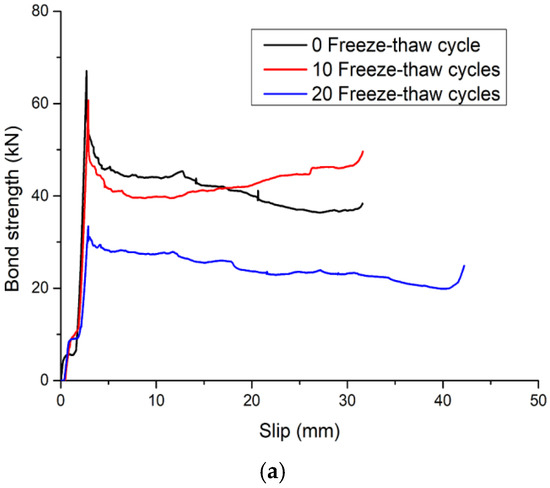 At this stage, it mainly depended on the chemical adhesion between the steel tube and the core concrete to bear the external load. At this time, the bond performance between the core concrete and the steel tube was good, the free end did not slip, the slip at the loading end was also small, and the load–displacement curve was linear. As the number of freeze–thaw cycles increased, the interface between the steel tube and the core concrete was damaged, resulting in a decrease in chemical adhesion;