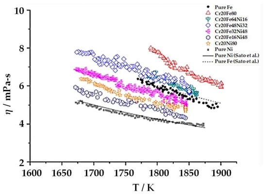 - Kobatake, H.; Brillo, J. Density and Viscosity of Ternary Cr–Fe–Ni Liquid Alloys. J. Mater. Sci. 2013, 48, 6818–6824. [Google Scholar] [CrossRef]