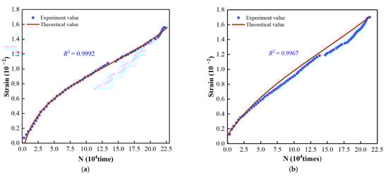 As shown in Figure 11, the comparison between the experimental and theoretical results shows that the theoretical and experimental curves of strain and AE cumulative ringing count have a high matching, which indicates that the coupling relationship between AE cumulative ringing count and strain considering loading rate is appropriate. The model can provide a reference for the deformation prediction of the same type of filling materials.