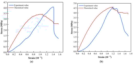 Figure 12 compares the stress–strain curves of ASPM specimens under different loading rates and the experimental results. At a low loading rate, the theoretical stress peak is smaller than the measured stress peak, and the peak strain is ahead of the measured value. With the increased loading rate, the theoretical peak stress and peak strain are close to the experimental results, which can better reflect the failure process of ASPM specimens from linear elastic transition to plastic deformation. Compared with the experimental results, the established model cannot effectively reflect the compaction stage of ASPM specimens under different loading rates, and the theoretical residual strength after the peak is greater than the experimental value.