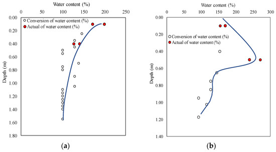 As shown in Equation (1), the water content in the depth direction can be calculated using Nd. Figure 5 shows the distribution of converted water content with depth in the areas № 1–3 calculated from Nd. The purpose of measuring the actual water content is to correct the distribution curve. This figure shows the distribution of natural water content in the sediments of the Kumamoto reservoir. It was discovered that clay with a high water content (exceeding 100%) was deposited at a depth of 1 to 2 m.