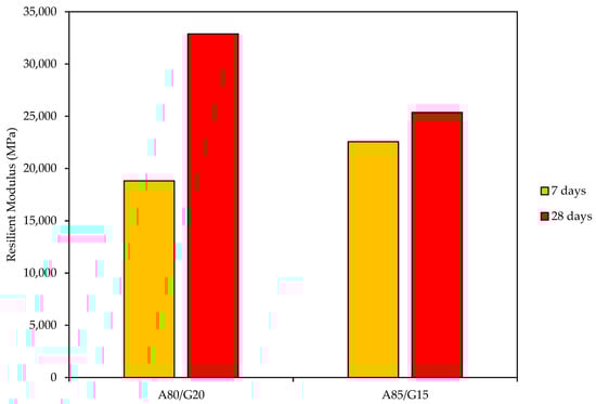 - The A80/G20 mixture obtained the highest resilient modulus of 32,881 MPa, and the same mixture also recorded the lowest is 18,819.3 MPa. These two mixtures magnitudinal relationship reflects the findings of the UCS test.