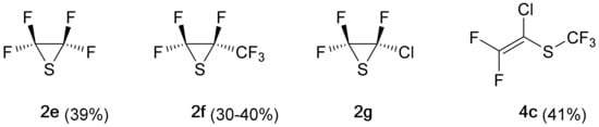 Heating of perfluoropropenoxide in the presence of difluorothiophosgene (thiocarbonyl fluoride) or trifluorothioacetyl fluoride in a closed reactor under pressure at 175 °C yielded the corresponding perfluorinated thiiranes 2e and 2f, respectively, in fair yields (Figure 1) [6]. The same method was applied for the preparation of chlorotrifluorothiirane (2g) [6,7].