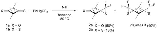 The [2+1]-cycloaddition of difluorocarbene, generated by thermal decomposition of PhHgCF3 (Seyfert’s reagent) in boiling benzene, with 2,2,4,4-tetramethyl-3-thioxocyclobutanone (1a) and its dithioxo analogue 1b gave the corresponding spirocyclic gem-difluorothiiranes 2a,b (Scheme 1) [4]. In the case of 1b, the formation of two isomeric 2:1-adducts, i.e., cis- and trans-3, in a ratio of 3:1 was also observed.