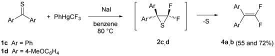 Aromatic thioketones 1c,d react under the same conditions with: CF2 yielding gem-difluoroethenes 4 via spontaneous desulfurization of the intermediate thiiranes 2c,d (Scheme 2) [4]. The mechanism of the desulfurization process is not known, but it is very likely that CF2 can play an important role in this reaction.