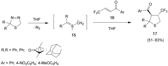 An attractive approach to the synthesis of fluoroalkylated thiolanes is the use of electron-rich, S-centered 1,3-dipols known as thiocarbonyl ylides (thiocarbonyl S-methanides) 15. They have to be generated in situ, preferably by thermal decomposition of corresponding 1,3,4-thiadiazolines. In the presence of a suitable dipolarophile, e.g., fluorinated α,β-unsaturated ketones 16, they easily undergo [3+2]-cycloaddition leading to five-membered S-heterocycles 17 (Scheme 8). If such dienophiles belong to the group of electron-deficient ethylenes, they are prone substrates for the [3+2]-cycloadditions with 15 [30].