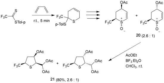 Recently, a new method for the synthesis of 2-trifluoromethyl thiolanes 21, based on the transformation of the unsaturated six-membered sulfoxide 20, was elaborated. The latter compound was prepared by the [4+2]-cycloaddition of the corresponding dithiocarboxylate with a suitable 1,3-diene. Taking into account the high total yield of isolated products, this ring contraction may be considered as a method of choice for the preparation of 2-trifluoromethyl thiolanes 21 (Scheme 10) [32].