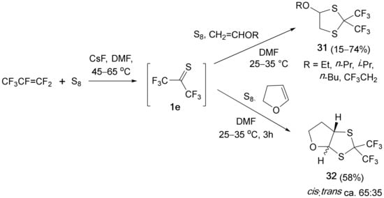 An unexpected formation of 1,3-dithiolanes 31 was observed upon treatment of perfluoropropene with elemental sulfur in the presence of vinyl O-alkyl ethers in DMF solution at 45–65 °C using CsF as a catalyst. Under the same conditions, dihydrofuran gave the bicyclic 1,3-dithiolane 32 in a 58% yield as a mixture of cis- and trans-isomer (Scheme 13) [17].