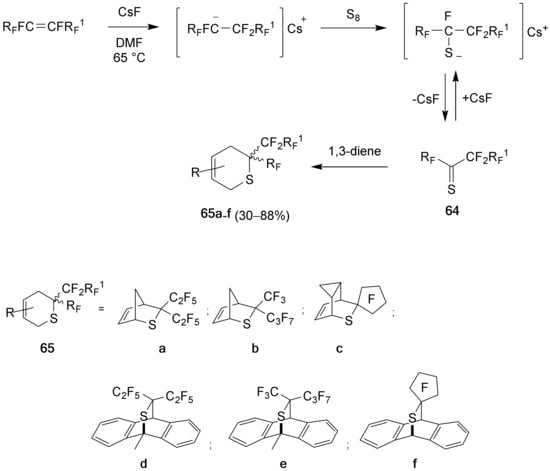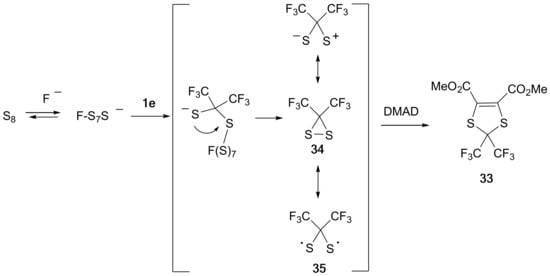 Replacement of the electron-rich vinyl ethers in the CsF-catalyzed sulfurization reactions of perfluoropropene by the electron-deficient dimethyl acetylenedicarboxylate (DMAD) led to the corresponding 1,3-dithiole 33 in a 70% yield (Scheme 14) [17].