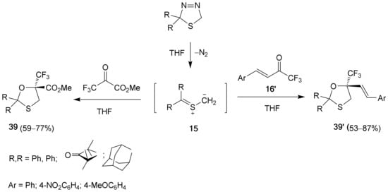 Thiocarbonyl S-methanides 15, generated in situ by N2 elimination from 1,3,4-thiadiazolines (see Section 4.1), undergo regioselective [3+2]-cycloaddition with the activated carbonyl group of trifluoropyruvic methyl ester to give 1,3-oxathiolanes 39a in a good yield (Scheme 18) [10].