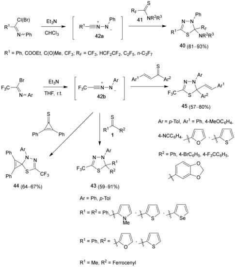 A new and accessible method for the synthesis of 2-amino-3-phenyl-2-polyfluoroalkyl-2,3-dihydro-1,3,4-thiadiazolines 40 containing various functional groups at C(5) via [3+2]-cycloaddition reactions of polyfluoroalkane thioamides 41 with fluorinated nitrile imines 42a was recently described (Scheme 19, equation above) [39,40]. Regioselective [3+2]-cycloaddition of 1,3-dipoles 42b with aryl, hetaryl and ferrocenyl thioketones [41,42] as well as with 2,3-diphenylcyclopropenethione [43] lead to the formation of a new type of fluoroalkylated 2,3-dihydro-1,3,4-thiadiazoles 43 and 44, respectively.