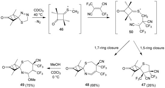 An interesting and rather unexpected observation was made in the course of studying the [3+2]-cycloaddition of thiocarbonyl ylide 46 to 1,2-bis(trifluoromethyl)-ethene 1,2-dicarbonitrile. Along with the expected five-membered product, i.e., the thiolane 47, formation of a seven-membered thiazepine derivative 48, with a ketenimine fragment incorporated into the heterocyclic ring, occurred predominantly (ratio 87:22) (Scheme 20) [47]. Its reaction with methanol gave the spirocyclic thiazepine derivative 49 as a mixture of two diastereoisomers.