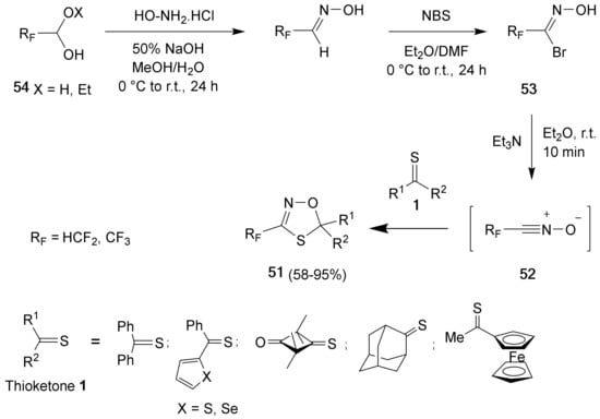 The 3-trifluoro- or difluoromethylated 1,4,2-oxathiazoles 51 can be efficiently prepared via the regioselective [3+2]-cycloaddition of fluorinated nitrile oxides 52 with thioketones 1 (Scheme 21) [51]. The nitrile oxides 52 are generated in situ by treatment of hydroximoyl bromides 53, which are obtained conveniently in two steps from the corresponding aldehyde derivatives 54, with triethylamine [52].