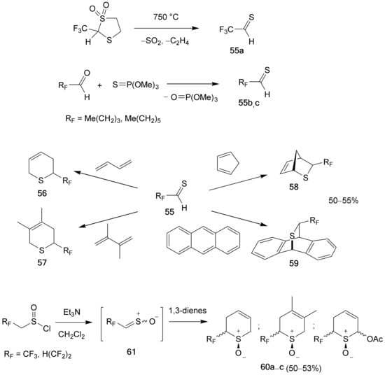 - Ogurok, V.M.; Siry, S.A.; Rusanov, E.B.; Shermolovich, Y.G. Polyfluoroalkyl sulfines derived from 1,1-dihydropolyfluoroalkanesulfinyl chlorides: Decomposition and [4+2]-cycloaddition reactions. J. Fluor. Chem. 2016, 189, 119–126. [Google Scholar] [CrossRef]
