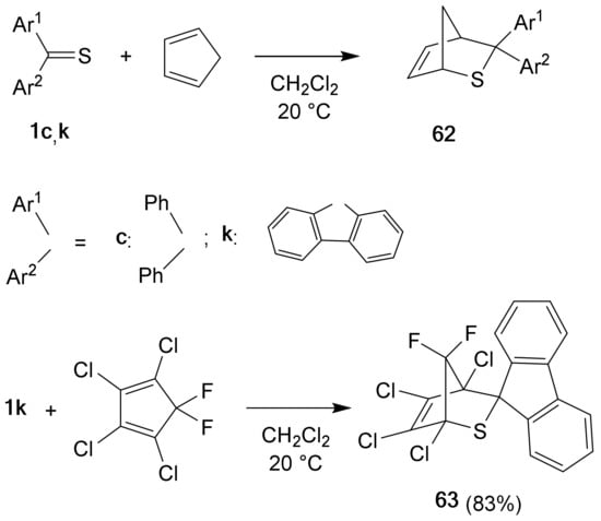 - Breu, J.; Höcht, P.; Rohr, U.; Schatz, J.; Sauer, J. Thiocarbonyl compounds in [4+2] cycloadditions: Preparative aspects. Eur. J. Org. Chem. 1998, 2861–2873. [Google Scholar] [CrossRef]