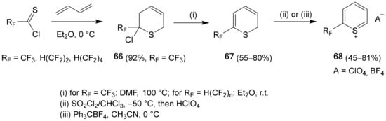 - Siry, S.A.; Timoshenko, V.M. 2-Polyfluoroalkyl thiopyrylium salts: Synthesis and reactions with nucleophiles. Tetrahedron Lett. 2010, 51, 6406–6409. [Google Scholar] [CrossRef]