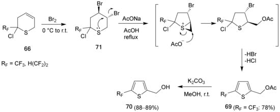 - Siry, S.A.; Timoshenko, V.M.; Shermolovich, Y.G. Sulfur-assisted ring contraction of polyfluoroalkylthiopyran derivatives as a route to functionalized fluorine-containing thiophenes. J. Fluor. Chem. 2016, 181, 17–21. [Google Scholar] [CrossRef]
