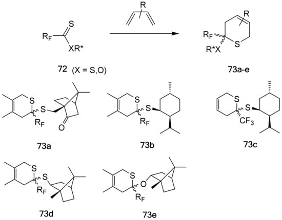 - Timoshenko, V.M.; Siry, S.A.; Rozhenko, A.B.; Shermolovich, Y.G. Asymmetric induction in thia-Diels-Alder reactions of chiral polyfluoroalkylthionocarboxylates. J. Fluor. Chem. 2010, 131, 172–183. [Google Scholar] [CrossRef]