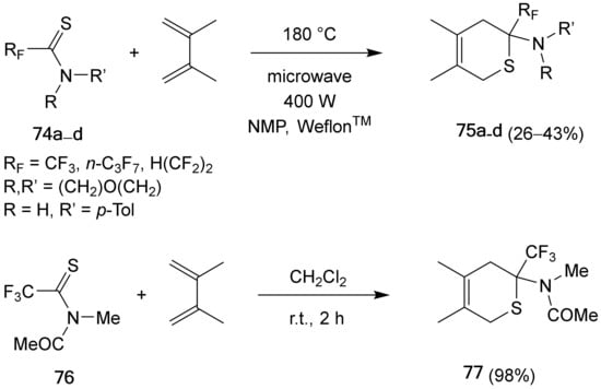 - Mikhailichenko, S.S.; Bouillon, J.-P.; Besson, T.; Shermolovich, Y.G. First synthesis of 2-aminosubstituted-2-perfluoroalkyl-3,6-dihydro-2H-thiopyrans by hetero-Diels-Alder reactions of fluorinated thioamides under microwave heating. Tetrahedron Lett. 2010, 51, 990–993. [Google Scholar] [CrossRef]