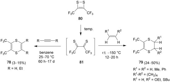 The reaction of thioketones or alkenes with bis(trifluoromethyl)thioketene (13) results in the regioselective formation of 1,3-dithietanes 14 (Scheme 7) or thietanes, correspondingly [26].