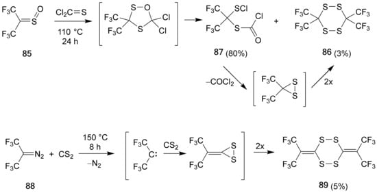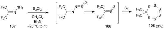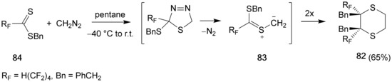 Middleton and Sharkey observed the formation of 2,2,4,4-tetrakis(trifluoromethyl)-1,3-dithiolane (22) when hexafluorothioacetone was treated with diazomethane in pentane solution at −78 °C and subsequently the reaction mixture was rapidly distilled (Scheme 11) [9].