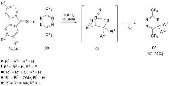 - Seitz, G.; Mohr, R.; Overheu, W.; Allmann, R.; Nagel, M. Donor-substituted thiocarbonyl functions as heterodienophiles in [4+2]-cycloadditions with inverse electron demand. Angew. Chem. Int. Ed. Engl. 1984, 23, 890–891. [Google Scholar] [CrossRef]