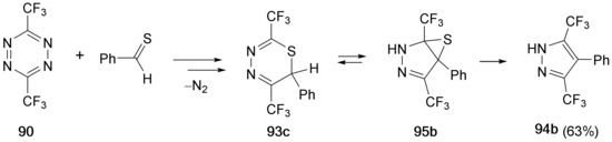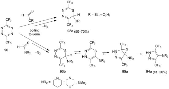 Only in the case of 2,2,5,5-tetrakis(trifluoromethyl)-1,3,4-thiadiazoline (6a), formed from 2-diazohexafluoropropane (5c) and hexafluorothioacetone (1e), was no evolution of N2 observed, and this product could be distilled in vacuum without decomposition [13]. The presence of four CF3 groups in 6a results in unusual stability, as in other cases 1,3,4-thiadiazolines are known to eliminate N2 easily [14].