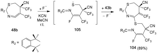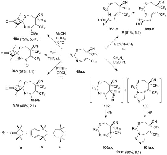 Other sterically crowded thiocarbonyl S-methanides that were derived, e.g., from 2,2,6,6-tetramethylcyclohexanethione, reacted with electron deficient, fluorinated ethylenes analogously, yielding seven-membered products. Some of them were isolated as crystalline materials and their structures, as well as that of some products of their further conversions, were unambiguously confirmed by X-ray measurements [48,49]. The formation of these unusual N,S-heterocycles was explained by the non-concertedness of the expected cycloaddition process and formation of stabilized zwitterionic intermediates of type 50, which competitively can undergo either 1,5- or 1,7-cyclization yielding the five-membered thiolane 47 or the seven-membered 1,3-thiazepine 48, respectively. The unusual stability of the heterocumulene (ketenimine) unit –N=C=C– was rationalized by ‘the magic effect’ of the trifluoromethyl group located at the neighboring C-atom [50]. Some chemical properties of 48 will be described in Section 6.