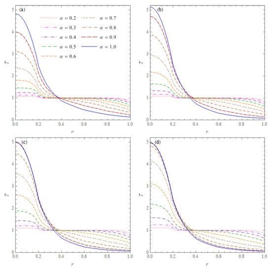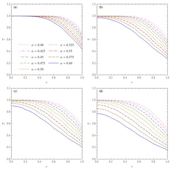 Dimensionless temperatures = T/20 °C in the cone without inner heat sources with initial temperature = 0 °C , versus for six values of the order of fractional derivative and four values of the non-dimensional time: (a) ; (b) ; (c) ; (d) .
