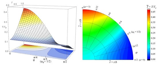 Temperature distribution in the hemisphere without an inner heat source when its surface is heated by an outer heat source defined by Equation (50) with and = 40 °C , as a function of non-dimensional space variables .