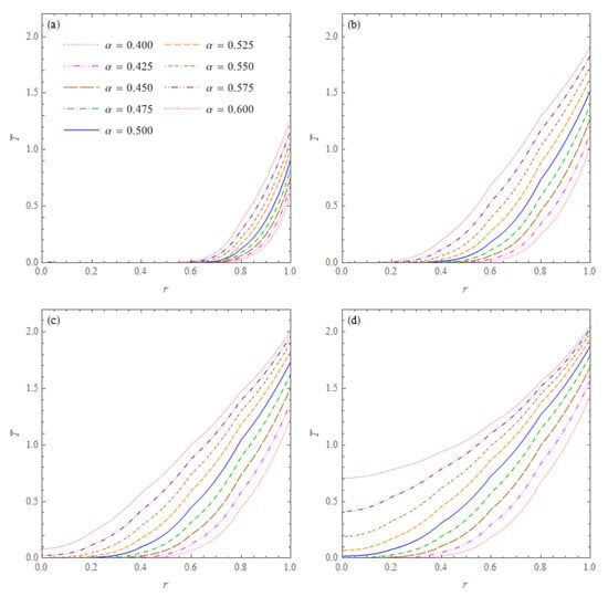 Dimensionless temperatures = T/20 °C in the cone with an inner heat source described by Equation (76) with , versus for six values of the order of fractional derivative and four values of the non-dimensional time: (a) ; (b) ; (c) ; (d) .