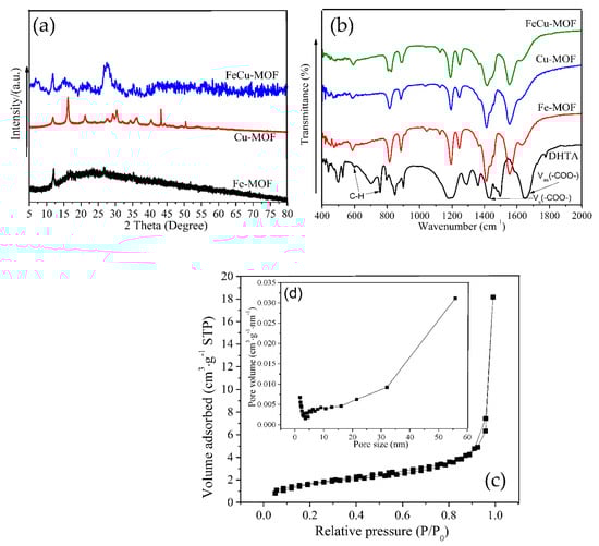 Fourier-transform infrared (FT-IR) spectroscopy was used to detect the surface functional groups in the as-prepared materials, as seen in Figure 1b. The absorption peaks at 1650 cm−1 and 1427 cm−1 in the ligands of DHTA samples were mainly due to vs(-COO-) and vas(-COO-) of coordination bonds between the organic ligands and the hydrogen atoms [26]. The absorption peaks at 750 cm−1 and 590 cm−1 were ascribed to the vibration of the C-H bond in the benzene ring [31,32]. Similar vibration absorption peaks were found in the infrared spectra of Fe-MOF, Cu-MOF, and FeCu-MOF, but most of these peaks shifted after the coordination reaction between metal ions and organic ligands [27,33]. This result indicated that metal ions and DHTA were successfully coordinated to form skeleton materials.