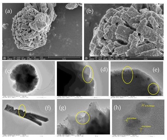 SEM images of FeCu-MOF (a,b); TEM images of FeCu-MOF (c–g); High resolution transmission electron microscopy (HRTEM) images of FeCu-MOF (h).