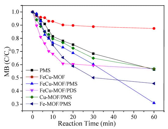 The catalytic activity of the bimetallic FeCu-MOF towards PMS was evaluated by determining the removal rates of MB. As shown in Figure 3, 43.4% of MB was removed in 60 min by solo oxidation of PMS. The removal rate of MB was less than 13% in the presence of only FeCu-MOF, revealing that FeCu-MOF showed weak adsorption capacity for MB. However, the removal rate of MB was 70.1% in the presence of both PMS and FeCu-MOF, indicating that FeCu-MOF exhibited good catalytic activity towards PMS. As a comparison, MB removal experiments were also performed in bimetallic FeCu-MOF/PDS and monometallic MOF/PMS systems. It was clearly seen that 40% of MB was removed at a rapid speed in the first 20 min in the FeCu-MOF/PDS system. However, the degradation process seemed to stop when the reaction time was prolonged. The removal rates of MB were 52.8% and 38.2% in the Fe-MOF/PMS and Cu-MOF/PMS systems, respectively, which were much lower than that in FeCu-MOF/PMS system. The low MB removal efficiency in Cu-MOF/PMS was probably due to the low catalytic performance of Cu-MOF towards PMS and the PMS adsorption on the catalyst, which hindered the MB oxidation and resulted in the MB removal being lower than that observed for solo PMS oxidation [37].