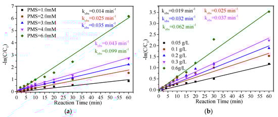 The effects of different PMS concentrations (1.0–6 mM) on the MB removal were investigated (Figure 4a). The result showed that the MB removal rate increased gradually with the increase in PMS concentration, ranging from 58.1% after 60 min with 1.0 mM to 100% with 6.0 mM. As shown in Figure 4a and Table 1, the MB removal exhibited a good fit to a pseudo-first-order model, and all R2 values were greater than 0.95. The rate constant (kobs) of MB removal increased from 0.014 min−1 to 0.099 min−1 as the PMS concentration increased from 1.0 mM to 6.0 mM. This result indicated that the removal of MB in this system strongly relied on the PMS concentration. As seen in Figure 4b, the removal rate of MB increased with the increase in FeCu-MOF dosage. The kobs of MB removal increased from 0.019 min−1 to 0.025 min−1, 0.032 min−1, 0.037 min−1, and 0.062 min−1 when the FeCu-MOF dosage increased from 0.05 g/L to 0.1 g/L, 0.2 g/L, 0.3 g/L, and 0.6 g/L, respectively. The increase in removal rate was due to the fact that the increased catalyst could effectively increase the number of active sites for activation of PMS, which can accelerate the generation of reactive oxygen species (ROS) for oxidation of MB.