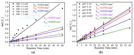 As displayed in Figure 5a, MB removal efficiency gradually decreased with the increase in initial MB concentration. Correspondingly, the kobs of MB removal decreased from 0.025 min−1 to 0.0048 min−1 when the MB concentration increased from 0.1 mM to 1.2 mM; similar results were found in other catalyst-based oxidation processes [12]. The solution pH plays an important role in organic pollutant removal in PMS-based oxidation systems, as it can influence the speciation of PMS (Equations (5) and (6)) [38]. It is necessary to investigate the effect of solution pH on the removal of MB. The effect of solution pH ranging from 3.16 to 10.87 on MB removal was explored, and the result is displayed in Figure 5b.