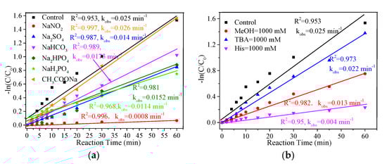 It is well known that industrial wastewater and surface water usually contain many anions that can affect the treatment of wastewater in advanced oxidation systems [40]. In order to understand the effect of common anions on the removal of MB in the FeCu-MOF/PMS system, the effects of different anions with concentrations of 50 mM on the MB removal were investigated. As shown in Figure 6a, most of the anions displayed inhibition effects on the MB removal. It was seen that the nitrite ion (NO2−) showed the strongest inhibition effect on MB with a kobs of 0.0008 min−1, followed by H2PO4− (0.0114 min−1), SO42− (0.014 min−1), HPO42− (0.0152 min−1), and HCO3− (0.0173 min−1). On the contrary, the addition of acetate ion (CHCOO−) promoted the removal of MB and achieved a kobs of 0.026 min−1. This was probably due to the fact that CHCOO− can act as an electron shuttle to promote electron transfer, thus improving the catalytic activity of PMS [20].