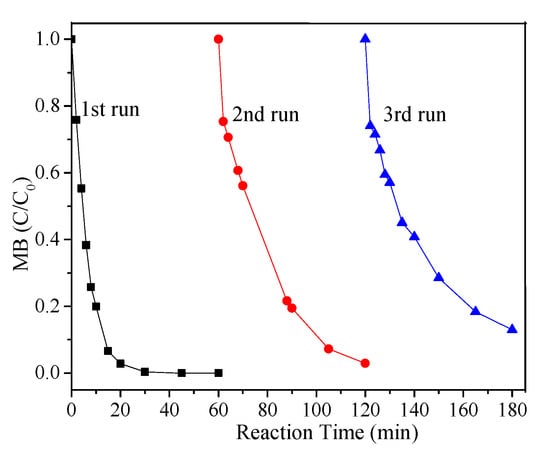 To evaluate the reusability of FeCu-MOF, recycling runs using the same FeCu-MOF were performed under the optimal reaction conditions. After each reaction cycle, the used catalyst was collected and washed three times. As displayed in Figure 7, the MB removal efficiency only decreased a little compared with the first run, where 100%, 97.1%, and 87.1% of MB were removed within 60 min in the first, second, and third runs, respectively. The slight decline in the MB removal efficiency was probably due to the loss of FeCu-MOF, which adsorbed on the filter paper and leached into aqueous solutions during the recycling process. This result indicated that efforts are still urgently needed to improve the water stability of FeCu-MOF from the viewpoint of engineering application.