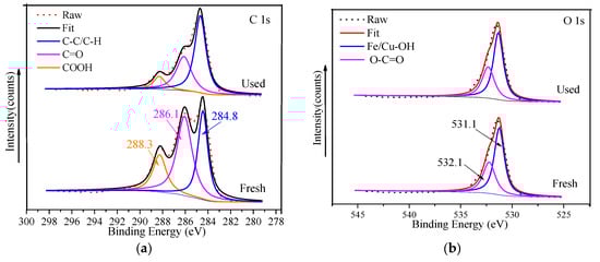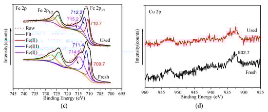 The high-resolution C 1s is shown in Figure 8a; the two peaks at 284.8 eV and 286.1 eV were respectively ascribed to the C-C/C-H bonds and C=O bonds in organic ligands. The peak located at 288.3 eV corresponded to carboxyl COOH bonds in ligands [26,27,33]. According to the O 1s high-resolution XPS spectrum of FeCu-MOF (Figure 8b), the O 1s peak was fitted into two peaks at 531.1 eV and 532.1 eV, which corresponded to Fe/Cu-OH and O-C=O [46]. As seen in Figure 8c, the Fe 2p3/2 spectra can be deconvoluted into three peaks centered at 709.7 eV, 711.4 eV, and 714.6 eV. Those peaks at 709.7 eV and 714.6 eV were assigned to the characteristic peaks of Fe(II), while the peak at 711.4 eV corresponded to Fe(III). After the reaction, the two peaks ascribed to Fe(II) shifted to 710.7 eV and 715.2 eV (see Table 3), respectively. Moreover, the peak area significantly decreased, indicating that Fe(II) participated in the PMS activation [43] (Equations (8) and (9)). Due to the low loading in the catalyst, the Cu 2p high-resolution XPS spectrum showed a small peak located at 932.7 eV (Figure 8d), which was assigned to Cu(I). The formation of Cu(I) caused a series of reactions (Equations (10)–(13)) and generated 1O2 to oxidize MB. The generation of a small amount of ·OH was mainly due to the transformation from SO4•− (Equations (3) and (14)). In addition, the shift of characteristic peaks of metal species (see Table 3) after the reaction further indicated that both Fe(II) and Cu(I) participated in activating PMS [47,48].
