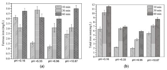 (a) The variation of ferrous iron ions under different initial pHs; (b) the variation of total iron irons under different initial pHs.