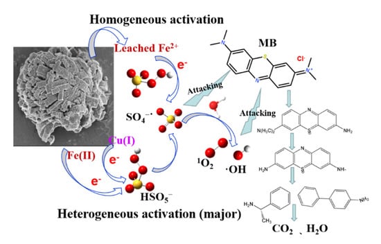 3.5. Possible Mechanism of PMS Activation by FeCu-MOF and MB Removal Mechanism