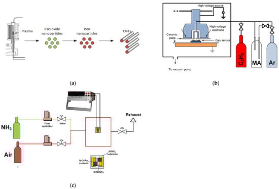 Figure 1. Scheme indicating all stages of synthesis of MWCNTs (a). Scheme of experimental setup for plasma treatment of MWCNTs on Si/SiO2 substrates (b). Scheme of equipment used for testing of gas sensors (c).