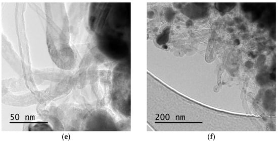 SEM images of the MWCNTs (after functionalization) used as an active material for ammonia gas sensors are depicted in Figure 2a–c. TEM images of the initial non-treated MWCNT sample are shown in Figure 2d–f. As can be seen, the morphology of carbon nanotubes remains almost unchanged after plasma functionalization with maleic anhydride because of the low duration of treatment and relatively mild plasma conditions. The samples of MWCNTs deposited directly on the Si/SiO2 substrate were represented by strongly entangled carbon nanotubes. The sample also contained a small fraction of cup-stacked carbon nanofibers and chain-like carbon nanofibers (Figure 2d–f) [23], formed as a result of growth of carbon on the large-size (above 20–30 nm in diameter) catalytic iron nanoparticles.