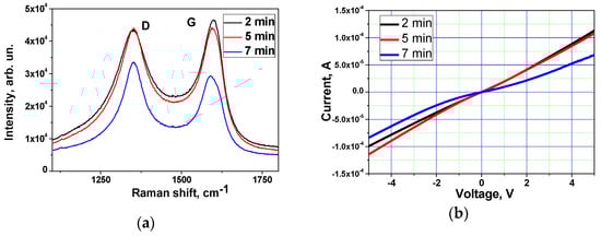 I–V curves of the active layer of ammonia gas sensors are presented in Figure 3b. The current–voltage (I–V) characteristic of the sensor treated for 2 min was almost linear, which corresponds to the conductive material. Increasing the treatment time led to the appearance of non-linearity of the I-V curve due to the change in the conduction mechanism to semiconducting because of the functional coating formed on the carbon surface. Sensor responses are shown in Table 2.
