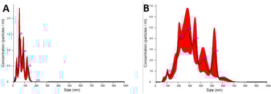 The particle size and distribution plots obtained in NTA analysis of bare P25 titania nanoparticles (A) and Pz@P25 nanoparticles (B).